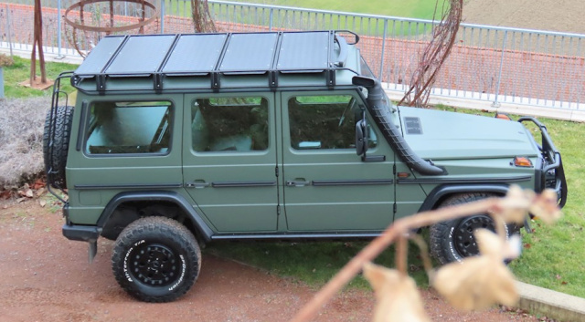 Die Basis für den Umbau ist ein 280 CDI von der Deutschen Bundeswehr. Diese Fahrzeuge waren mehr oder weniger handelsübliche Fahrzeuge mit militärischen Sonderausstattungen und wurden beispielsweise als Führungsfahrzeug eingesetzt. Dank Allradantrieb inklusive Sperre vorne und hinten ist die G-Klasse das optimale Gefährt abseits von befestigten Straßen. Die 183 PS werden mittels 5-Gang Automatikgetriebe an die Räder übertragen. In seiner 15-jährigen Zeit als Einsatzfahrzeug hat dieser 280 CDI Greenliner 176.000 Kilometer abgespult.