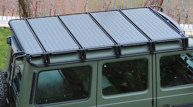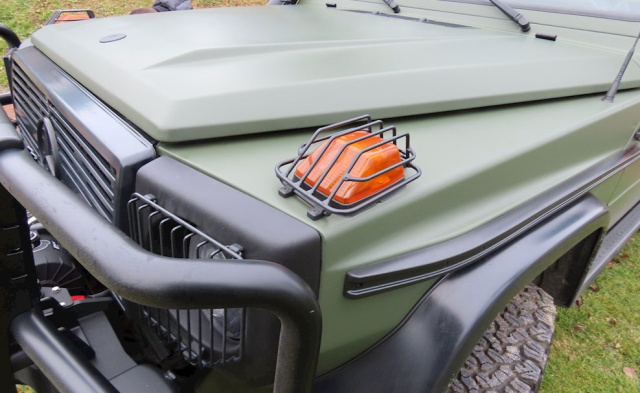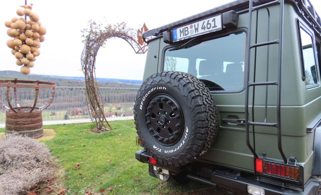 Ein zusätzlicher Schnorchel sorgt für eine höhere Wattiefe. Ein angebrachter Dachträger für mehr Stauraum auf langen Reisen, die Hutchinson Beadlock Felgen sehen nicht nur kraftvoll aus, sie geben dem Greenliner auch den nötigen Halt, denn sie helfen, den Kontakt zwischen Felge und Reifenwulst aufrecht zu erhalten, auch wenn der Reifendruck deutlich abgesenkt wird. Passend dazu wurden Kotflügelverbreiterung verbaut, die den G an beiden Seiten 60 Millimeter breiter und bulliger machen. Mehr Schutz bieten auch die "Rockslider", die das Fahrzeug vor Beschädigungen von der Seite und von unten absichern sollen. Damit sich der Veteran auch durch das herausfordernste Gelände wühlen kann hat S-TEC eine Seilwinde in den abklappbaren Rammschutz integriert.