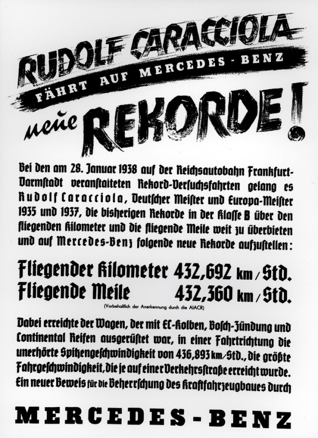 Mit dem Mercedes-Benz W 125 Zwölfzylinder-Rekordwagen stellt Rennfahrer Rudolf Caracciola am 28. Januar 1938 den weltweit gültigen Geschwindigkeitsrekord auf einer öffentlichen Straße auf: 432,7 km/h erreicht er auf der Autobahn zwischen Frankfurt am Main und Darmstadt über einen Kilometer mit fliegendem Start. Überschattet wird der Erfolg vom tödlichen Unfall des Konkurrenten und Auto-Union-Rennfahrers Bernd Rosemeyer am gleichen Tag. Die Faszination Hochgeschwindigkeit hat dennoch bis heute nichts verloren: