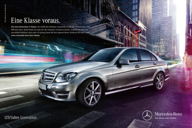 Zur Markteinführung der neuen Generation der C-Klasse startet Mercedes-Benz heute eine umfassende Kampagne. Unter dem Claim Eine Klasse voraus unterstreicht die integrierte Marketingoffensive in selbstbewusster Gelassenheit den Führungsanspruch der C-Klasse in ihrem Segment. Denn mit einer neuen Wertigkeit im Innenraum, die höchste Design-und Komfortansprüche erfüllt, und einer äußerst umfangreichen Sicherheitsausstattung bietet die jüngste Generation des volumenstärksten Mercedes-Modells dasselbe hohe Niveau wie die aktuellen Oberklasse- und Luxusfahrzeuge und wird damit abermals neue Maßstäbe im Segment der kompakten mittleren Premiumklasse setzen.