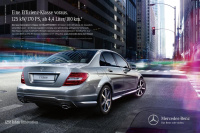 Während TV-Spots und PreRoll in einer ländlichen Umgebung spielen, zeigt sich die C-Klasse in den Printanzeigen in einem urbanen Umfeld. Der Look Living City inszeniert auf besondere Weise die Sportlichkeit und Dynamik der neuen Bestseller-Generation. Das Fahrzeug steht jeweils prominent vor einer urbanen, lebendigen Kulisse, die allerdings nicht im Detail zu erkennen, sondern durch eine besondere Fototechnik dramatisch überhöht gezeichnet ist. Jede Anzeige greift mit einer prägnanten Botschaft ein herausragendes Merkmal der neuen C-Klasse auf beispielsweise den ATTENTION ASSIST mit Denkt an Sie, wenn Sie an etwas anderes denken oder die außergewöhnliche Sparsamkeit mit Eine Effizienz-Klasse voraus. Ergänzend dazu werden im Hörfunk sogenannte Bi-Spots geschaltet, die zu einem Besuch beim Händler am 26. März 2011 einladen.