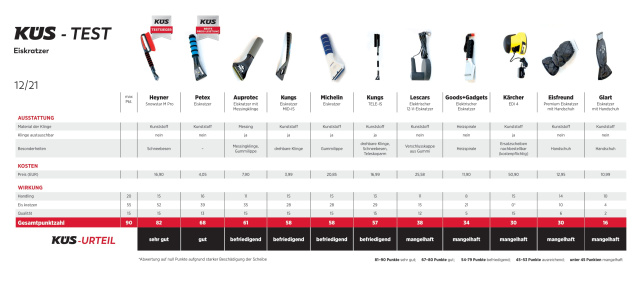 Testsieger mit großem Vorsprung und der Note „sehr gut" ist der Heyner Snowstar M Pro (siehe Ergebnistabelle). Er punktet nicht nur bei dünner, sondern auch bei dicker Eisschicht mit herausragenden Kratzleistungen. Die Länge des Eisschabers ist dank angeschlossenem Schneebesen auch ideal für große Fahrzeuge. Ähnlich gute Ergebnisse bei dünner Eisschicht liefert der Eisschaber von Petex, der bei dickem Eis etwas hinter Heyner zurückbleibt, sich aber als Preis-Leistungs-Sieger mit der Note "gut" den zweiten Platz sichert. Allerdings hinterlässt der Petex auf verschmutzen Scheiben vereinzelt Kratzer.
