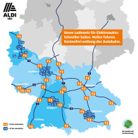 Die neuen Ladesäulen haben eine Leistung von 50 kW und können von allen gängigen Elektroauto-Modellen genutzt werden. Je nach Fahrzeugtyp ist damit eine Reichweitenverlängerung von bis zu 200 Kilometern in gut 30 Minuten zu erreichen. „Bisher haben wir uns auf die Ballungszentren und Innenstädte konzentriert. Jetzt ermöglichen wir unseren Kunden auch, ihre Urlaubsfahrten, mit uns zu planen“, so Florian Kempf. Der Discounter wird somit Ende 2018 mehr als 80 Ladesäulen für Elektroautos anbieten. Derzeit verfügen 53 ALDI SÜD Filialen über eine Elektrotankstelle. Noch im Sommer dieses Jahres wird der Großteil der 28 neuen ALDI SÜD Ladestationen in Betrieb genommen. Kunden können den Grünstrom kostenlos und ohne Registrierung während der Filialöffnungszeiten tanken. Der Strom dafür wird während der Sonnenstunden von einer Fotovoltaikanlage auf dem Dach der Filiale produziert
