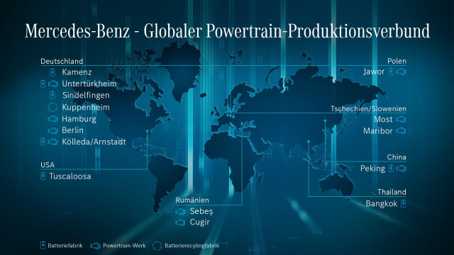 Die Batteriefabriken Kamenz und Brühl (Standort Untertürkheim) sowie Peking (China) werden Batterien für die neuen Modelle der MMA und MB.EA-Plattformen produzieren. Der Aufbau einer Batteriemontage am Standort Kölleda ist, vorbehaltlich der Unterstützung der Thüringer Landesregierung, ebenfalls geplant. Der Standort verantwortet heute konventionelle und hybridisierte Motoren und geht nun einen wichtigen Schritt in der Elektro-Transformation. Die Landesregierung hat dem Unternehmen in einer Absichtserklärung entsprechende Unterstützung zugesichert. Die Werke Untertürkheim, Sebes (Rumänien) und Peking werden ab 2024 elektrische Antriebseinheiten für die neuen Modelle der MMA und MB.EA-Plattformen produzieren. Das Werk Untertürkheim verdoppelt dabei im Zielbild die bisher angekündigten Produktionskapazitäten von elektrischen Antrieben auf eine Million Einheiten (Weitere Informationen: https://group-media.mercedes-benz.com/marsMediaSite/ko/de/54709944). Die Mercedes-Benz Werke Hamburg und Untertürkheim (Werkteil Mettingen) bleiben auch in Zukunft die deutschen Kernwerke für die Montage elektrischer Achsen und Komponenten. Sie beliefern den Produktionsverbund der Mercedes-Benz Aufbauwerke mit Systemen der nächsten Generation. Das Mercedes-Benz Werk Berlin wird - wie im vergangenen Jahr angekündigt – ab Mitte der Dekade leistungsstarke Elektromotoren für die künftige AMG.EA-Plattform produzieren.