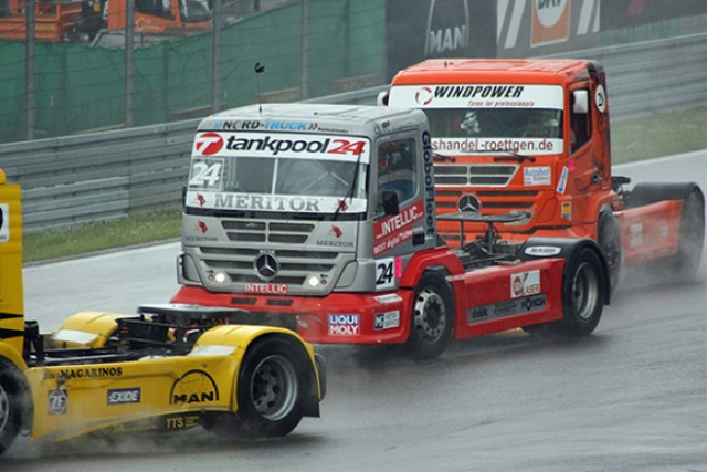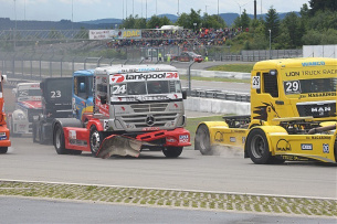 Immerhin sind wir bester Mercedes, denn hier am Ring kommt ein zweiter Axor ins Starterfeld dazu. Heinz Werner Lenz, der `King vom Ring` und mehrfache Europameister gibt sich die Ehre in einem identischen Modell wie meins. Alle vier Rennen sehe ich die Zielflagge vor ihm. Das macht mich ein bisschen stolz, denn Heinz Werner ist nun wirklich eine Größe in diesem Sport.