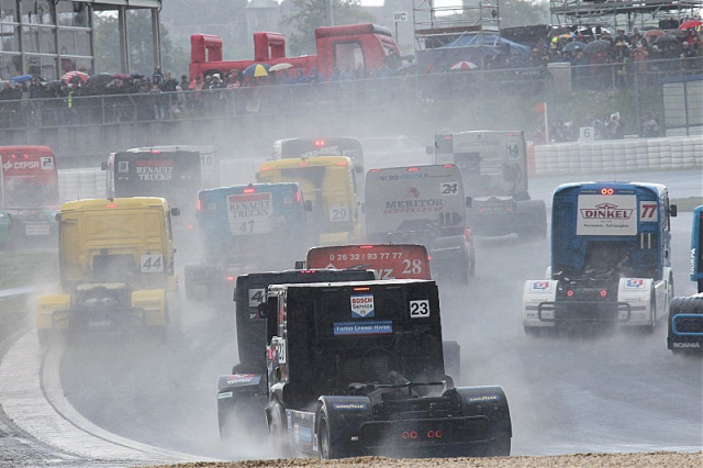 Hallo Freunde, hier herrscht PARTYSTIMMUNG!!! Wir haben heute nicht nur unseren ersten Punkt geholt, sondern sogar gleich VIER. Ein Riesenerfolg für unser kleines Privatteam! Wir sind happy. Aber von Anfang: Der ganze Vormittag (ach was, bis auf drei Stunden der ganze Tag) war, wie erwartet, komplett verregnet. Das hat die echten Truck Race Fans allerdings nicht davon abhalten können, trotzdem zum Ring zu pilgern. Volle Tribünen bei den Rennen, selbst in den unüberdachten Bereichen, zeugen von echter Liebe der Fans zum Truck Sport.
