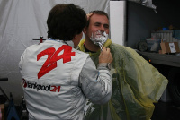 Mein Mechaniker Thomas verliert nach dreizehn Jahren seinen Bart (für den ersten Punkt) und ich hoffe, seine Freundin, die ihn noch nie ohne gesehen hat, bleibt bei ihm...Richtig feiern können wir aber noch nicht, denn Morgen gibt es das Ganze ja nochmals von vorn mit den Rennen drei und vier des Wochenendes. Und natürlich gibt es beim Heim GP die meisten Pressetermine zu absolvieren. Unter anderem stehe ich mit Gerd Körber, der einen sensationellen zweiten Platz einfahren konnte noch auf der Country Showbühne an diesem Abend.