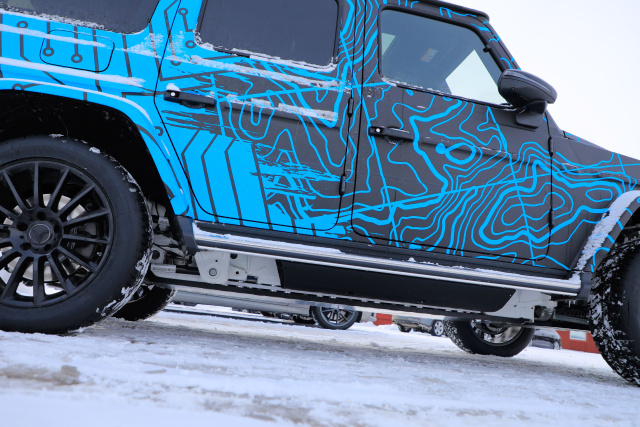 Informationen zu Reichweite und Leistung der elektrischen G-Klasse möchte Mercedes-Benz noch nicht verraten. Der EQG wird (optional) mit einer völlig neuen Generation von Batteriematerialien kommen, welche die Energiedichte in den Akkus beträchtlich erhöht. Hierbei handelt es sich um eine Entwicklung der US-Firma Sila. Bekannt ist bereits auch, dass der EQG mit vier Elektromotoren kommen wird, also ein Motor für jedes Rad. Damit soll der G nicht nur im Gelände eine gute Figur machen, sondern auch den sogenannten Tank Turn können. Tank Turn? Schonmal gehört? Mit der Funktion wird der EQG in der Lage sein, sich wie ein Kettenfahrzeug auf der Stelle um die eigene Achse zu drehen, also wie ein Panzer. Aktuell funktioniert das dank einer elektronischen Sperre rein im Gelände und auf sandigem Untergrund – auf Asphalt wären die Kräfte zu stark, die auf Reifen und Mechanik einwirken. Ob das "Karussel" später auch wirklich in der Serienversion eingebaut ist, bleibt allerdings abzuwarten.