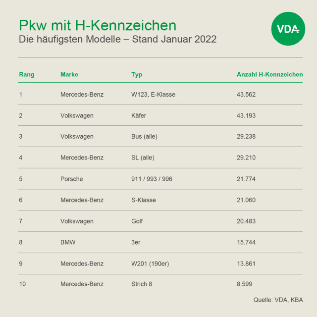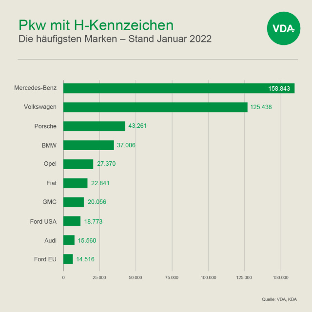 Hinsichtlich der Marken führt in der Auswertung der mit H-Kennzeichen registrierten Fahrzeuge Mercedes-Benz mit 158.843 Einheiten. Das entspricht einem Plus von 12 Prozent gegenüber dem Vorjahr. Es folgen Volkswagen mit 125.438 Fahrzeugen (+ 10 Prozent), Porsche mit 43.261 Fahrzeugen (+ 13 Prozent), BMW mit 37.006 Fahrzeugen (+ 19 Prozent) und Opel mit 27.370 Fahrzeugen (+ 8 Prozent).