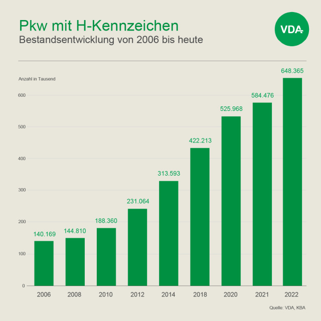 In Deutschland waren am 1. Januar 2022 rund 648.000 Pkw mit H-Kennzeichen oder mit der Emissionsklasse 0098* angemeldet. Das ergab eine aktuelle Auswertung des Oldtimer-Bestandes in Deutschland durch den Verband der Automobilindustrie (VDA) und die BBE Automotive GmbH auf Grundlage von Zahlen des Kraftfahrt-Bundesamtes (KBA). Damit stieg der Bestand von Pkw mit H-Kennzeichen sowie Emissionsklasse 0098 im Vergleich zum 1. Januar 2021 um rund 10 Prozent von 548.476 auf 648.365 Einheiten.