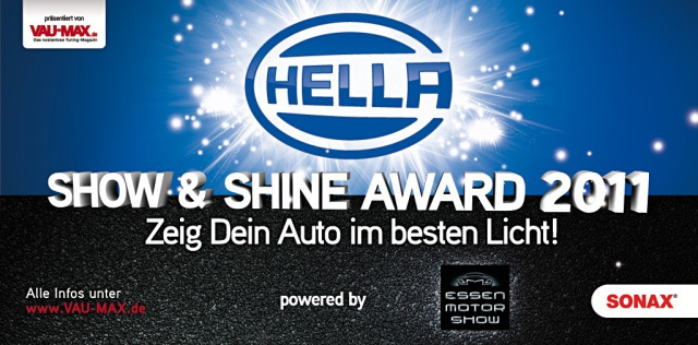 Für viele begeisterte Tuning-Fans, die einen VW, Audi, BMW, Opel oder auch andere Automarken fahren, ist der HELLA Show & Shine Award 2011 schon längst ein Begriff. So nehmen auch dieses Jahr wieder zahlreiche Freunde des Auto-Tunings mit ihren hochkarätig umgebauten Fahrzeugen an diesem Wettbewerb teil, der im Rahmen der Essen Motor Show, dieses Jahr zusammen mit dem Autopflegespezialisten SONAX, zum vierten Mal stattfindet.