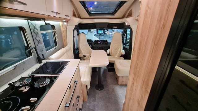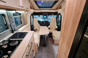 Einzig die Farbe Sandgrau steht als Lackierung zur Wahl, immer gibt es auch die Landkartengrafik als Schmuckelement. Der solide Dachträger ist mit 60 Kilogramm belastbar, er nimmt auch die beiden Solarzellen mit jeweils 135 Watt Spitzenleistung auf. LED-Leuchtbalken vorn und hinten sowie seitliche Umfeldleuchten sollen bei Dunkelheit bessere Sicht beim Rangieren und Manövrieren verschaffen, außerdem gegebenenfalls Tunichtgute abschrecken. Zusätzlich zu den beiden Solarmodulen auf dem Dach gibt es eine weitere Solarzelle mit 190 Watt Spitzenleistung, sie kann ebenfalls bei Bedarf auf dem Dach aufgebaut werden. Die auf 60 Ah verstärkte Lichtmaschine hilft außerdem während der Fahrt beim Laden des Lithium-Akkus, er hat eine Kapazität von 330 Ah und versorgt über einen Wechselrichter mit drei kW auch alle 230-Volt-Steckdosen an Bord. Der Umformer schafft 2400 Watt Dauerleistung und 6000 Watt in der Spitze. Das Ladegerät versorgt die Batterie bei Landstromanschluss mit bis zu 16 Ah, falls das Stromnetz auf dem Campingplatz niedriger abgesichert ist, kann es auch auf vier, sechs, acht oder 12 Ampere heruntergeregelt werden.