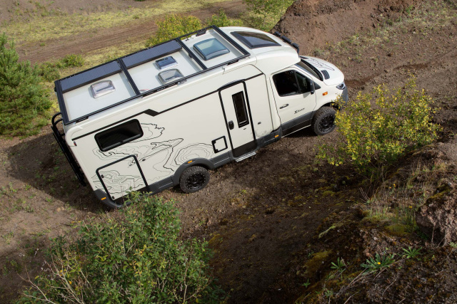 Eura Mobil will sich unbedingt in der Premium-Klasse etablieren, darum, sagt Technik-Chef Frank Schmidt, habe man beim neuen Spitzenmodell X-Tura nur die feinsten Komponenten genommen, die der Markt anbietet. Basis ist der Mercedes-Benz Sprinter 4x4 mit dem 160-PS-Motor (118 kW) und permanentem Allradantrieb. Den Diesel mit 190 PS (140 kW), der dann automatisch mit einer Automatik kombiniert wird, gibt es gegen Aufpreis im Paket. Der Aufbau des 6,88 Meter langen Campers wird holzfrei im Sealed-Structure-Klebeverfahren hergestellt, das aus der Luftfahrt stammt. Jeder einzelne Meter des Aufbaus ist mit bis zu 3,5 Tonnen belastbar, das führe zu extremer Torsionsfestigkeit, so Frank Schmidt. Zusammen mit den Offroad-Reifen und den Geländerädern (ebenfalls als Extra im Angebot) liegt die Bodenfreiheit bei 40 Zentimetern, der Böschungswinkel hinten bei 22 Grad.Markant ist die Optik des X-Tura.