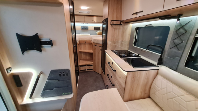 Der Grundriss des X-Tura bietet auf 2,20 Metern Breite die Sitzgruppe vorn, Küche und Waschraum in Wagenmitte und zwei 196 mal 80 Zentimeter große Einzelbetten im Heck. In der 2700 Liter großen Garage darunter finden Fahrräder und Ausrüstung Platz, ihr Boden ist mit Riffelblech verkleidet, dank zahlreicher Zurrösen bleibt auch bei holpriger Fahrt alles an seinem Platz. Das Leergewicht des Campers liegt bei 3350 Kilogramm, das zulässige Gesamtgewicht bei 4,1 Tonnen. Der Frischwasservorrat erscheint mit 145 Litern für 30 Tage Autarkie eher knapp bemessen, in den Abwassertank, dessen Ablassventil elektrisch geöffnet wird, passen 105 Liter.