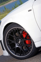 Die komplett neue GT-Motorhaube trägt zwar keinen Stern mehr, weist dafür aber mit kraftvollen Konturen und integrierten Entlüftungsöffnungen auf die unter ihr lauernde Kraft hin. Um optische Akzente zu schaffen, wurden bei abgebildeten Fahrzeug zudem das gesamte Dach, der Kühlergrill, die Entlüftungsöffnungen in der Motorhaube, Teile der Frontschürze und der Außenspiegel sowie der Heckschürzeneinsatz und die Abrisskante auf dem Heckdeckel in maximal kontrastierendem Glanzschwarz foliert. In den Radhäusern des Fotofahrzeugs rotieren dazu zweiteilige BBS CH-R II-Felgen im 21-Zoll-Format, die mit Continental Sport Contact-Walzen der Dimensionen 255/35R21 an der Lenk- sowie 285/30R21 an der Antriebsachse bezogen wurden.