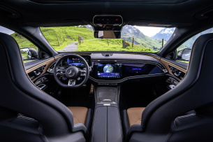 Das Fahrwerk des E53er Kombis mit einer Kombination aus Stahlfederung mit verstellbaren Dämpfern ist stramm, aber alles andere als hart und passt damit gut zum Nutzerverhalten, denn nicht wenige Kunden dürften den Edelsportler auf der Langstrecke nutzen. Erstmals serienmäßig in dieser Liga: eine Hinterachslenkung, die je nach Umgebung gleichermaßen Wendigkeit und Fahrdynamik bietet. Das hilft ebenso wie die imposante Motorleistung, das gewaltige Leergewicht von 2.435 Kilogramm zu überspielen, das sich nicht allein in schnell gefahrenen Kurven bemerkbar macht. Serienmäßig gibt es schmale 19-Zöller, die sich optional auf bis zu 21 Zoll vergrößern lassen und die Radhäuser imposanter ausfüllen. Die Motorleistung wird dabei über eine elektromechanische Kupplung zwischen den beiden Antriebsachsen verteilt. Und das ist angesichts dieser Dynamik nicht nur bei Regen, Eis oder Schnee ein großer Wurf.