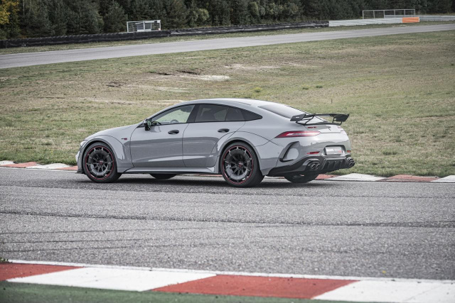 Im Grenzbereich lässt sich der 5,07 Meter lange Schwabe mit Lenkrad und Gasfuß präzise in der Spur halten. Wer es jedoch zu flott angehen lässt, kommt der Betonmauer zu Beginn der Boxengasse unangenehm nah, während der abgeschaltete Kühlturm nebenan einen Schatten auf Teile des kurvigen Renngeschlängels wirft. Was für eine Rakete – was für ein Vortrieb für maximal vier Insassen, die sich auf prächtig verarbeiteten Ledersesseln über die Strecke prügeln lassen. Der BRABUS Rocket 900 ist der wohl exklusivste AMG GT Viertürer, aktuell in jedem Fall der stärkste, spektakulärste und mit 505.000 Euro auch der teuerste. Dafür gibt es einen Auftritt, der einem optisch wie technisch den Atem raubt und das Publikum mehr als verstört zurücklässt. Denn mit dem Breitbau-Karosseriekit, den gigantischen 900 PS und bis zu 330 km/h Spitzentempo ist man exklusiver unterwegs als mit einem Bugatti Chiron, denn es werden gerade einmal zehn Fahrzeuge gefertigt. Weihnachten steht ja vor der Tür.