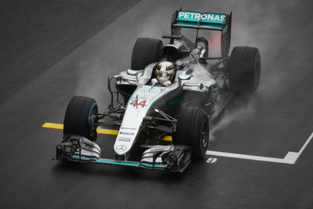 Der angekündigte Starkregen setzte pünktlich zum Rennen am Sonntag ein. Nach einer zehnminütigen Verspätung startete das Feld deshalb hinter den Safetycar, wo es auch lange sieben Runden blieb. Erst dann entschloss sich Rennleiter Charly Whiting, das Feld auf die Reise zu schicken. Ohne den stehenden Start wurde Nico Rosberg um die Möglichkeit beraubt, seinen im Qualifying schnelleren Teamkollegen Lewis Hamilton in der ersten Kurve anzugreifen, so dass ihm nur Platz zwei blieb. Im Hinterfeld allerdings passierten in den ersten Runden durch die schlechten Bedingungen und die offensichtlich hoffnungslos überforderten Regenreifen von Pirelli mehrere haarsträubende Unfälle, aufgrund derer man das Safetycar wiederum vor das Feld setzte. Beim folgenden Restart flog Ferrari-Pilot Kimi Räikkönen auf der Gerade wegen Aquaplanings in die Bande. Mehrere nachfolgende Piloten können einen Crash mit dem havarierten Ferrari nur mit Mühe vermeiden. Daraufhin wird das Rennen mit der roten Flagge abgebrochen.