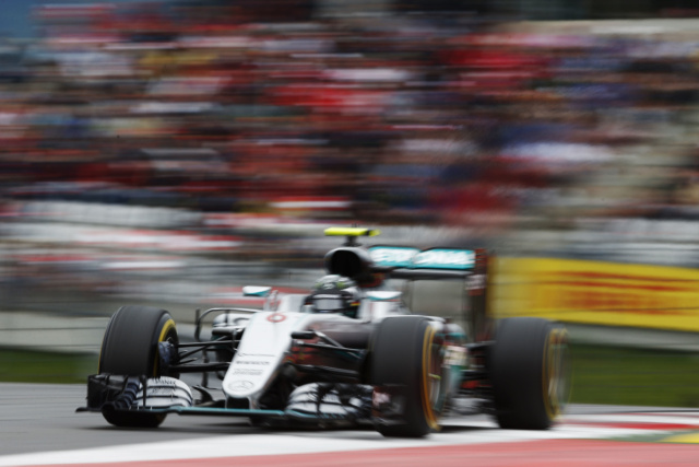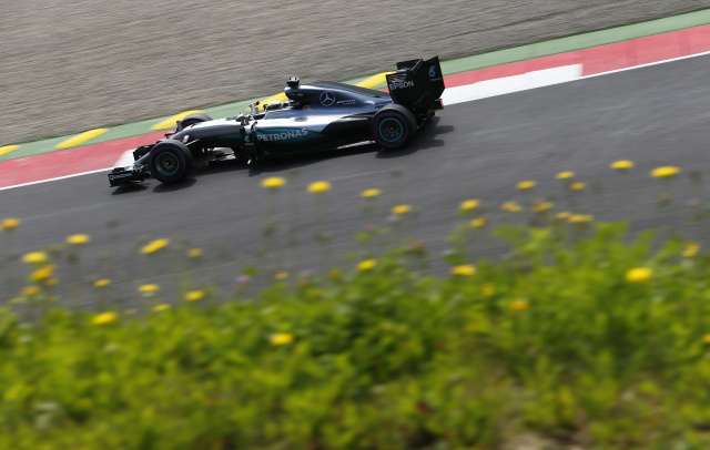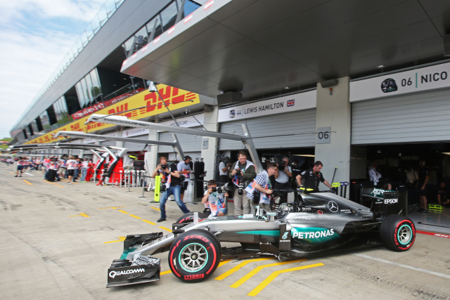 Als der zu dieser Zeit führende Sebastian Vettel einen gefährlichen Reifenplatzer infolge zu lange gefahrener Reifen erlitt, entschloss man sich bei Mercedes-AMG, auch Hamilton aus Sicherheitsgründen auf eine Zweistopp-Strategie zu setzen. Dabei bekam der Brite einen frischen Satz Soft-Reifen aufgezogen. Nico Rosberg hatte keine neuen Soft-Pneus mehr, weshalb er auf die roten Super-Soft gehen musste.