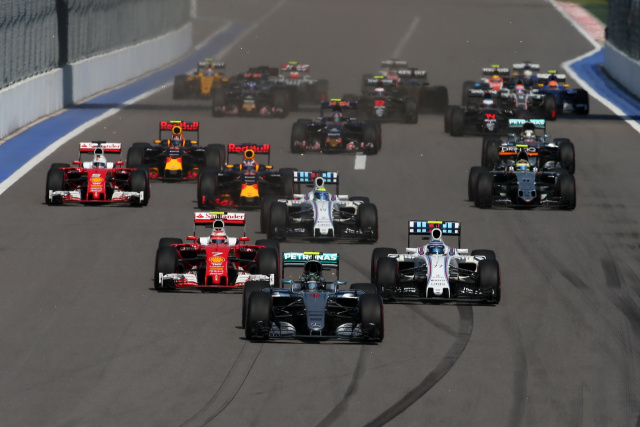 Beim Start konnte Nico sofort vorn weg ziehen, während hinter ihm das Chaos ausbrach. Lokal-Matador Daniil Kwyat im Red Bull verlor vor lauter Aufregung vor seinem Heim-Publikum sowohl die Kontrolle über sein Fahrzeug als auch über sich selbst und krachte Ferrari-Pilot Sebastian Vettel völlig unnötig gleich zwei Mal ins Heck, worauf dessen Rennen schon nach wenigen Metern beendet war. Nachdem es zwischen den beiden bereits beim letzten Rennen in Shanghai zu Reibereien kam, wird das wohl keine Männerfreundschaft mehr werden. Dass der Russe eine zehnsekündige Stop&Go-Strafe - die härteste Rennstrafe im Katalog - bekam, half dem betrübten Vettel auch nicht mehr.