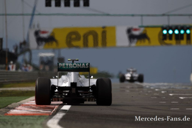 Die rutschigen Straßenverhältnisse schienen für die Silberpfeile durchaus von Vorteil zu sein. Nico Rosberg und Michael Schumacher starteten prächtig und fanden sich auf den Plätzen vier und fünf wieder. Aber die Freude währt nicht lange, denn von hinten rückte erst Ferrari-Pilot Alonso den Mercedes GP-Piloten auf den Pelz, dann aber auch Mark Webber.