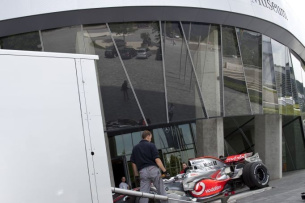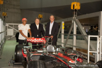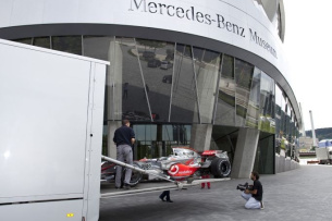 In diesem Jahr feiert Mercedes-Benz 75 Jahre Silberpfeil. Anlässlich der Jubiläumsfeierlichkeiten kamen Formel-1-Pilot Lewis Hamilton und Mercedes-Benz Motorsportchef Norbert Haug zum das Mercedes-Benz Museum nach Stuttgart. Dort sollte im Rahmen der Feier das Weltmeisterfahrzeug von 2008, der MP4-23, per Kran an seinen neuen Platz gehoben werden. Nun sind in der Steilkurve alle legendären Rennwagen seit 1934 zu sehen.