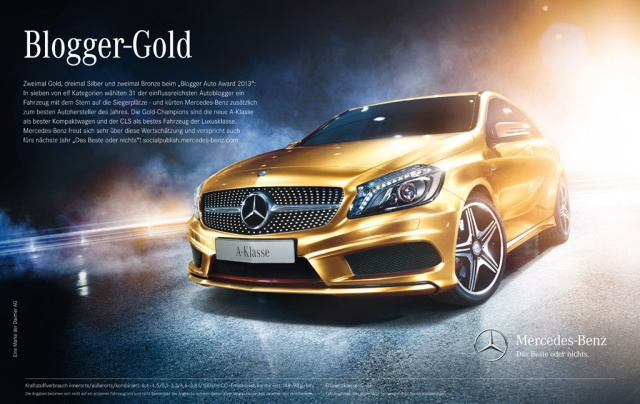 Die Autozeitschrift in Papierform ist ein in die Jahre gekommenes Medium; sie vermag nicht Schritt zu halten mit der Schlagzahl der Onlinemedien. Die Aktualität der Autozeitung besteht in den Nachrichten von gestern. Wer sich über das Thema Automobil informieren will, wird nirgendwo schneller mit Daten, Fakten und Meinungen bedient als in den Szene-Foren, Autoblogs oder elektronischen Magazinen wie Mercedes-Fans.de. Beim Blogger Auto Award 2013 belegt Mercedes-Benz als einziger Automobilhersteller gleich in zwei Kategorien den ersten Platz. Die deutschen Autoblogger küren die neue A-Klasse mit der höchsten Punktzahl von 97 Punkten zum besten Kompaktwagen. In der Luxusklasse wählen sie das viertürige Coupé CLS auf den ersten Platz. Insgesamt erobert Mercedes-Benz in sieben von elf Kategorien einen der ersten drei Plätze und wird zusätzlich als bester Autohersteller des Jahres ausgezeichnet.