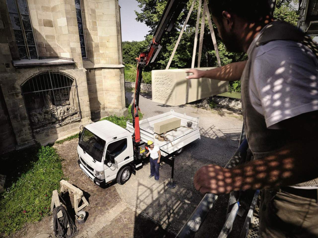 Nicht für jede Arbeit braucht der Natursteinbetrieb gleich einen 7,49-Tonner. Für viele Aufgaben, sei es beim Zuliefern oder Werkzeugtransport reicht auch ein kleinerer 3,5-Tonner. Damit kann der Fliesenleger oder Steinmetz viele der typischen Aufträge dieser Branche effektiv und kostengünstig in Angriff nehmen. Der Fuso Canter Typ 3S13 mit Dreiseitenkipper ist hierfür ein perfekter Helfer. Es handelt sich um ein sehr schmales Fahrzeug, das inklusive Aufbau lediglich 1,80 m breit und somit ideal für den Einsatz beispielsweise auf Friedhofswegen geeignet ist. Bei einem Radstand von 2500 mm verfügt der kleine Kipper über einen Wendekreis von nur 10,6 m, was ihn zu einem der wendigsten seiner Klasse macht.