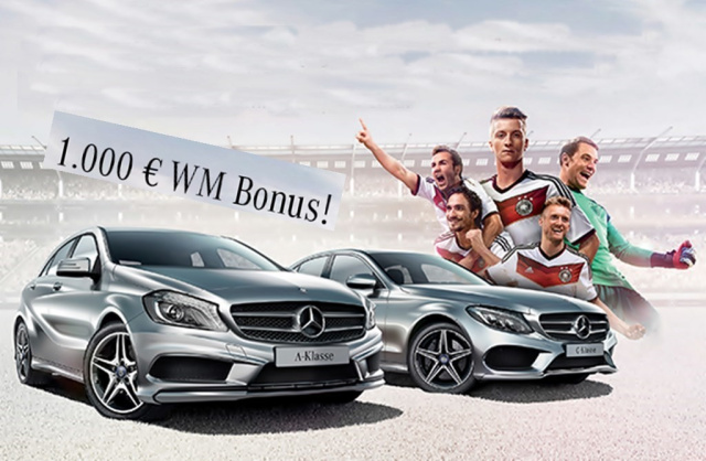 Bereit wie nie" lautet die Losung der DFB-Kicker zur heute beginnenden Fußball-Weltmeisterschaft in Brasilien. Als Hauptsponsor der deutschen Fußballnationalelf hat Mercedes-Benz aber nicht nur für Jogis Jungs reichlich Support übrig. Auch Mercedes-Benz-Kunden oder solche, die es werden wollen, können jetzt ein Schnapp machen und von einem besonderen Angebot profitieren: Wer sich jetzt beim Mercedes-Benz Partner eine A-, B-, CLA- oder GLK-Klasse bestellt, der erhält einen WM-Bonus von 1.000 Euro. Klingt verlockend? Zu lange sollte man aber nicht nur mit dem Gedanken spielen einen neuen Mercedes zu kaufen oder zu attraktiven Konditionen zu leasen, denn das Angebot ist nur so lange gültig, wie die deutsche Nationalmannschaft an der Fußballweltmeisterschaft teilnimmt.