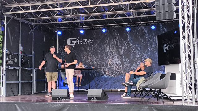 Auf der Bühne waren einige der prominentesten Persönlichkeiten und Ikonen der Mercedes-Benz G-Klasse vertreten. Heinrich Wangler, Produktmanager Toni Mäntele, sowie Peter Fischer vom Mercedes-Benz Geländewagen-Club und eingefleischter G-Klasse Fahrer, teilten ihre faszinierenden Geschichten und Einblicke. Auch Benjamin Senkal sprach über seine Leidenschaft und Erfahrungen mit der G-Klasse. Diese Vorträge waren ein Highlight der Veranstaltung und boten den Besuchern interessante Einblicke in die Geschichte und die Entwicklung der G-Klasse.
