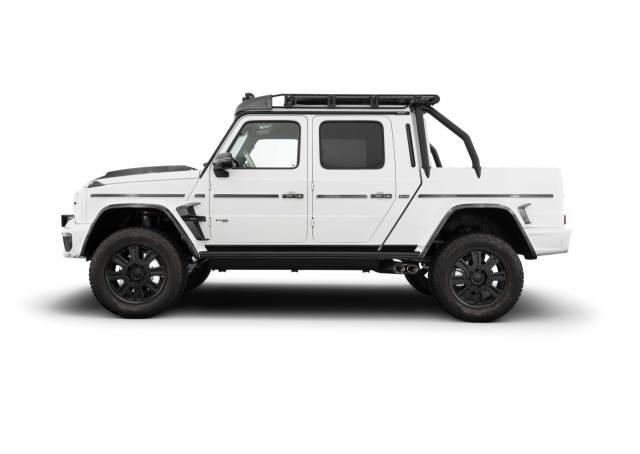 5,31 Meter lang ist der auf 22-Zöllern anrollende Pickup, der dank eines speziellen Fahrwerks mit Portalachsen, welches eine Bodenfreiheit von 490 mm ermöglicht, locker über Stock und Stein rumpelt. Aber nicht nur im Gelände zeigt sich der BRABUS 800 Adventure XLP SUPERWHITE von der starken Seite, sondern auch unter der Motorhaube. Sein 4-Liter-Biturbo-V8 leistet 800 PS und 1 000 Nm Drehmoment. Auf dem Asphalt beschleunigt der umgebaute Mercedes-AMG G63 in 4,8 Sekunden von 0 bis 100 km/h. Der Topspeed des bärenstarken BRABUS Offroad-Pickups ist allerdings auf 210 km/h elektronisch begrenzt.