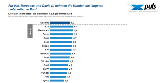 Es gibt vermutlich nicht viel,was die Interessenten für einen Neuwagen von Dacia und Mercedes-Benz gemeinsam haben - doch eine Übereinstimmung gibt es auf jeden Fall: Laut einer aktuellen Studie des Marktforschungsinstitutes puls sind sowohl Dacia- als auch Mercedes-Benz-Interessenten bereit, 5,9 Monate länger auf einen bestellten Neuwagen zu warten. Nur Kia-Interessenten sind noch etwas geduldiger.