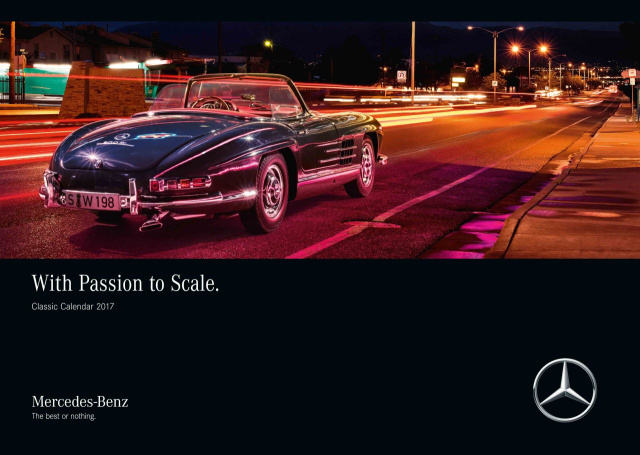 Der Mercedes-Benz Classic Kalender “With Passion to Scale“ – Mit Leidenschaft und Maßstab. Verblüffend anders führt der Classic Kalender durch das Jahr 2017. Jedes der 12 Motive zeigt einen bekannten Klassiker aus der Markengeschichte von Mercedes-Benz. Doch erst auf dem zweiten Blick offenbart sich dem Betrachter die Finesse der Aufnahmen: die abgebildeten Protagonisten sind ausschließlich Fahrzeugmodelle im Maßstab 1:18. Sie sind liebevoll patiniert und in realer Landschaft fotografisch inszeniert. Es ist eine Welt für sich, in der unvergessliche Straßenfahrzeuge, legendären Rennwagen und populären Nutzfahrzeuge die Hauptrollen spielen. Stimmungsvoll und immer mit einem Augenzwinkern überrascht der Classic Kalender Monat für Monat - Mit Leidenschaft und Maßstab. (Größe: ca. 69 x 49 cm, 32,90 €)