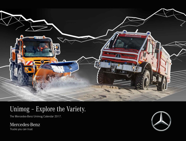 Der neue Unimog Kalender 2017. Erleben Sie die Vielseitigkeit des Unimog: auf 12 atemberaubenden Bildern in den unterschiedlichsten Einsätzen rund um den Globus. (Abmessungen: 45 x 34 cm, 32,90 €)