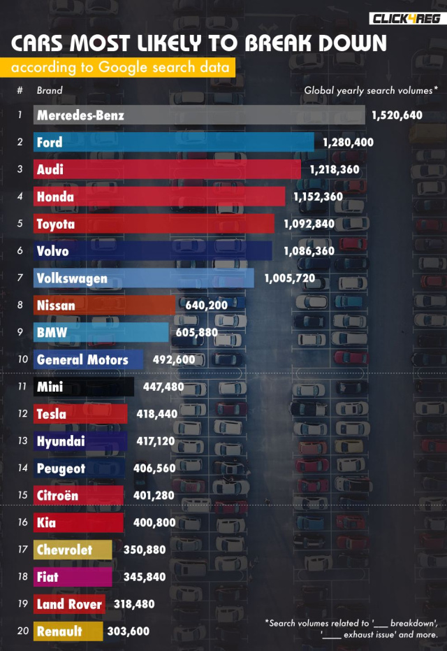 Die Welt ist immer mehr auf das Auto als sicheres Fortbewegungsmittel angewiesen, und mit zunehmender Nutzung steigt auch die Wahrscheinlichkeit, dass es zu Problemen und Pannen kommt. Welche Automarken sind also die unzuverlässigsten? Click4Reg, wollte das herausfinden. Mithilfe des SEO-Tools Ahrefs.com wurden Keyword-Variationen für die 20 weltweit führenden Automarken untersucht, um herauszufinden, welche Marke weltweit am häufigsten mit einer Autopanne in Verbindung gebracht wird. Und das ist in dieser Auswertung Mercedes-Benz. Über 1,5 Millionen (1.520.640) Menschen sollen laut Cklick4Reg nach Mercedes-Benz und Pannenhilfe googeln. Dass Click4Reg daraus die Schlussfolgerung zieht, dass die Marke Mercedes-Benz die unzuverlässigste alle untersuchten Automarken sei, ist allerdings alles andere als nachvollziehbar. Schließlich kann man eine Google-Suchanfrage noch lange nicht mit einer echten Panne gleichsetzen, da in die Auswertung auch die Google-Suche nach Ersatzteilen bzw. Tipps zur Reparaturhilfe mit einflossen. Wenn also ein Schrauber//Hobbymechaniker für seinen Mercedes-Benz bei Google nach einer DIY-Reparaturanleitung sucht, dann heißt es ja nicht, dass hier ein Pannenfall vorliegt.