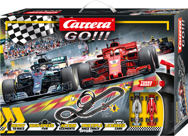 Im Formel-1-Set Carrera GO!!! No Limits stehen sich Ferrari und Mercedes im Duell gegenüber. Im Ferrari SF71H tritt Sebastian Vettel gegen den Mercedes-AMG F1 W09 EQ Power+ mit Lewis Hamilton an. Auf der 8,9 Meter langen Carrera GO!!! Rennstrecke mit zwei Loopings, engen Kurven, Fly-Over, Steilkurve und Highspeed-Gerade müssen die beiden Profis alles geben und zeigen, wer der Meister des Wohnzimmer Grand Prix wird.