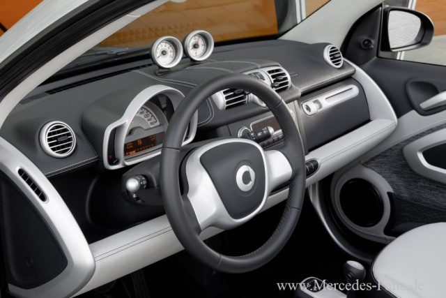 Elegant geht es ebenso im Innenraum zu. Serienmäßig ist das exklusive Lederpaket, das dem Fahrzeug vor allem durch die Sitze in kristallgrauem Leder/Stoff-Mix eine außergewöhnliche, luxuriöse Anmutung schenkt. Darüber hinaus umfasst es ein Instrumententafel-Oberteil aus schwarzem Kunstleder mit hellgrauen Kontrastnähten, ein Kniepad aus kristallgrauem Kunstleder sowie Türverkleidungen in einer kristallgrauen Kunstleder/Stoff-Kombination. Die Akzentteile sind beim smart fortwo pearlgrey in silber matt gehalten, serienmäßig an Bord sind ferner Zusatzinstrumente (Cockpituhr und Drehzahlmesser), ein Audiosystem sowie exklusive Fußmatten mit eingenähtem Edition-Schriftzug.