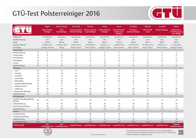Die GTÜ Gesellschaft für Technische Überwachung hat in einem Praxistest zehn gängige Polsterreiniger verglichen. Testsieger mit dem Prädikat "sehr empfehlenswert" wurde der Aktivschaum-Reiniger von Nigrin, der mit 6,70 Euro für die 500-ml-Flasche auch noch besonders günstig zu haben ist. Platz zwei belegte der ebenfalls sehr empfehlenswerte, jedoch fast doppelt so teure Auto-Innenreiniger von Clean Extreme, gefolgt von den empfehlenswerten Armor All Universal Aktiv Schaum Reiniger, Kim Tec Polster- & Innenraum-Reiniger, Sonax PolsterSchaumReiniger, Sonax Xtreme Polster- & Alcantara-Reiniger, Dr. Wack A1 Polster-Schaum-Reiniger, Mannol 9931 Textile Foam und Caramba Polster-Reiniger. Ausgerechnet die Nummer 1 im GTÜ-Vergleich, nämlich Nigrin, erzielte mit seinem zweiten getesteten Produkt Textil-Reinigung und -Pflege aus der Performance-Serie nur ein "bedingt empfehlenswert".
