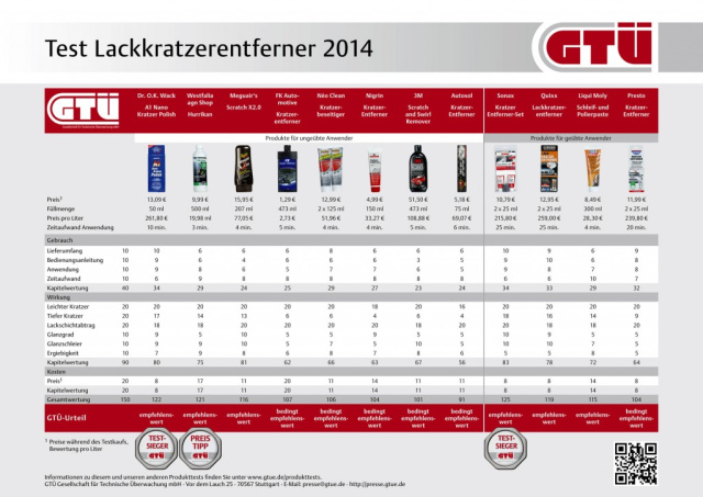 Die GTÜ untersuchte acht Produkte, die auch ungeübten Anwendern keine Probleme bereiten sollten, sowie vier Mittel, die sich eher an fachkundige Benutzer richten. Platz 1 in der Kategorie für ungeübte Anwender belegte mit dem Prädikat empfehlenswert das A1 Nano Kratzer Polish von Dr. O.K. Wack, knapp gefolgt von der besonders preiswerten Feinschleifpaste Hurrikan aus dem Westfalia-AGN-Shop, die dafür das Prädikat GTÜ-Preis-Leistungssieger bekam. Auf Platz 3 liegt das ebenfalls empfehlenswerte Meguiar's Scratch X2.0. Dahinter reihen sich fünf bedingt empfehlenswerte Produkte ein, nämlich FK Automotive Kratzer-Entferner, Néo Clean Kratzerbeseitiger, Nigrin Kratzer-Entferner und 3M Scratch and Swirl Remover sowie Autosol Kratzer-Entferner.