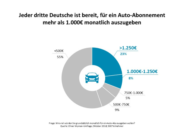 Mobilität der Zukunft? Offenbar ja, wie eine aktuelle Umfrage der international tätigen Managementberatung von Oliver Wyman zeigt. Demanch existiert ein Anfangsinteresse am Auto-Abo, begleitet von auffälliger Zahlungsbereitschaft im Hochpreissegment. Gerade im Premiumbereich entstehen neue Chancen für flexible Anbieter. Noch wachsen beim Thema Abo für Autos die Bäume nicht in den Himmel: "Die Kunden sind erst dabei, sich an diesen Gedanken zu gewöhnen", sagt Joachim Deinlein, Partner bei Oliver Wyman. Auf den ersten Blick wirken die Zahlen ernüchternd, die die Strategieberatung in einer Umfrage unter 500 deutschen und 500 amerikanischen Teilnehmern erhoben hat: Demnach äußern nur 26 Prozent in Deutschland und 14 Prozent in den USA ein grundsätzliches Interesse an dieser neuen Form der flexiblen Autonutzung. Doch könnten sich drei von zehn Interessenten in Deutschland vorstellen, ihr Auto zugunsten eines Abo-Modells abzuschaffen.
