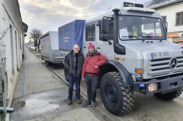 Unimog U 4000 vom Unimog-Club Gaggenau bringt Hilfsgüter zu Erdbebenopfern im Katastrophengebiet der Region Petrinja (Kroatien). Auf dem Foto zu sehen sind René Dusseldorp (links) und Greg Köhler (rechts) vor dem vollgepackten Unimog Gespann mit 14 Metern Länge.