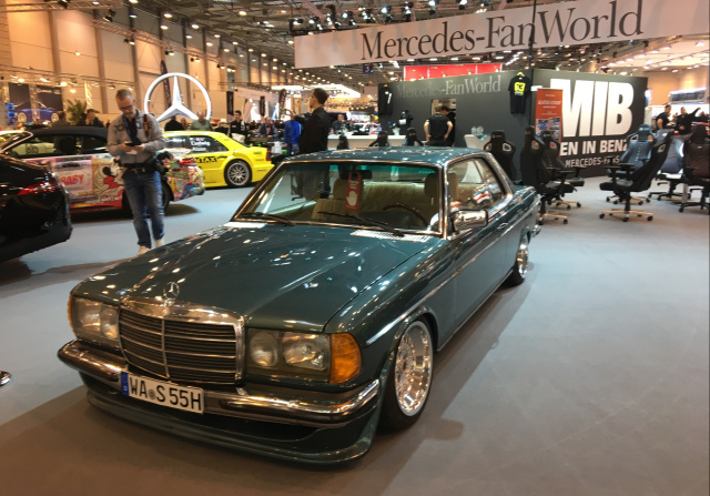 Dieser Mercedes-Benz 230 CE der Baureihe C123 ist das Fahrzeug, mit dem die Geschichte der Firma „Highest Low“ begann, und präsentiert sich als echter Tieflieger. Das Coupé war der erste Umbau des Teams und wurde als erstes Fahrzeug seiner Baureihe überhaupt mit einem Luftfahrwerk von Highest Low ausgestattet. Der Mercedes-Benz 230 CE aus dem Jahr 1983 wurde aber nicht nur mit einem Air Ride versehen, sondern bekam die Front-Stoßstange von Lorinser und ein Nardi-Lenkrad. Das Luftfahrwerk von Highest Low der 3. Generation wird in Verbindung mit Sachs-Dämpfern zusammengestellt und bietet dadurch ein smoothes Fahrgefühl.