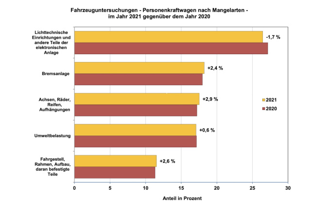 Der häufigste Mangel bei den Pkw war wie schon im Vorjahr die Lichtanlage und andere Komponenten der Elektronik bei 5,0 Millionen Fahrzeugen. Der Anteil lag damit bei 26,5 Prozent und ging um 0,7 Prozent zurück. Mängel in der Bremsanlage (2021: 18,2 und 2020: 18,0 Prozent) waren die zweithäufigste Mangelart, gefolgt von der Kategorie Achsen, Räder, Reifen, Aufhängungen. Knapp dahinter der Bereich Umwelt / Abgasverhalten mit einem leichten Zuwachs auf 17,1 Prozent aller Fahrzeuge.