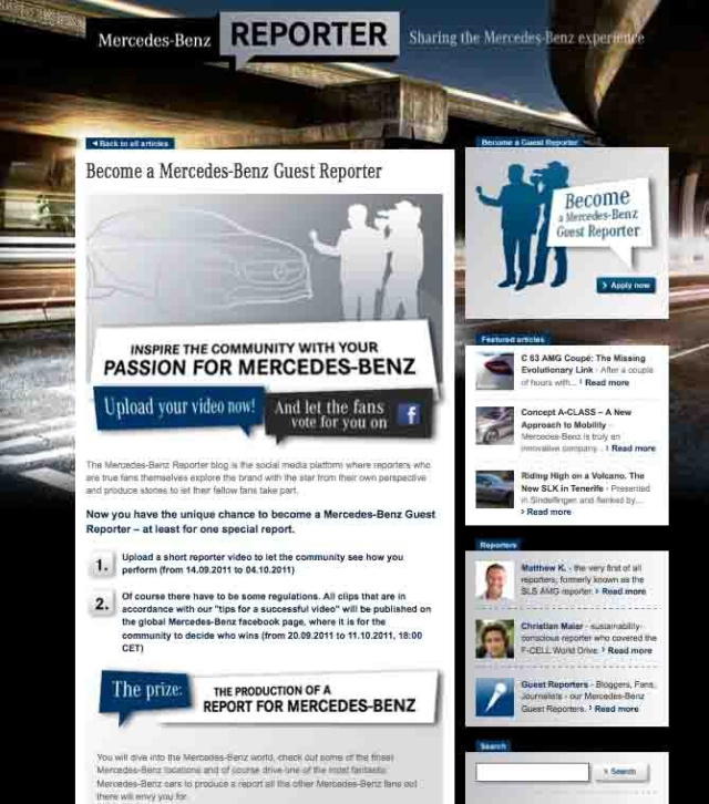 Unter dem Motto Inspire the Community with Your Passion for Mercedes-Benz ruft die Stuttgarter Premium-Automobilmarke auf ihrer Facebook-Seite alle Fans auf, sich an dem Casting zu beteiligen oder sich selbst zu bewerben. Die Bewerbung erfolgt direkt auf dem Mercedes-Benz Reporter Blog. Wer neuer Reporter werden möchte, kann dort vom 14. September bis 4. Oktober ein frei gestaltetes zweiminütiges Video hochladen, in dem er seine Reporterqualitäten darstellt. Am 20. September beginnt die Votingphase der Fans, die bis zum 11. Oktober für ihren Favoriten stimmen. Dem neuen Gastreporter winkt als Hauptpreis die Produktion einer eigenen Videoreportage. Für die Dreharbeiten wird er tief in die Welt von Mercedes-Benz eintauchen, verschiedene Orte besuchen, mit Experten sprechen und unterschiedliche Fahrzeuge testen. Zusätzlich erhält der Gewinner eine Aufwandsentschädigung für seine Bewerbung und ein Honorar.