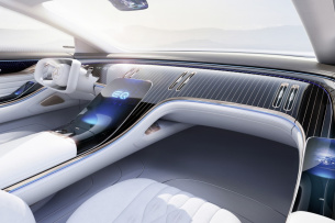 Lounge-Charakter mit vier bequemen Einzelsitzen hat der Innenraum des EQS Showcars zu bieten. Bedienhebel und -knöpfe sucht man auf dem cleanen Armaturenbrett vergebens. Touchpads übernehmen die komplette Steuerung.