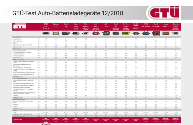 Testsieger mit dem Prädikat "sehr empfehlenswert" wurde das schwedische CTEK CT5 Time to go. Auf den nachfolgenden Plätzen vier weitere sehr empfehlenswerte Ladegeräte: das Gysflash 6.12, Bosch C3, Noco Genius G7200 und Dino Batterieladegerät 12V/5A. Als "empfehlenswert" stuften die GTÜ-Tester fünf weitere Ladegeräte ein: APA Mikroprozessor 6V/12V 5A, AEG LD 5.0, Pearl Kfz-Ladegerät 12V/24V, Pro User Battery Charger DFC 900N und Black & Decker BDV090 6V/12V. "Bedingt empfehlenswert" waren EUFAB EAL 6V/12V, Einhell CC-BC 6 M, Absaar EVO 6.0 sowie Excelvan Battery Charger 6V/12V 5A.