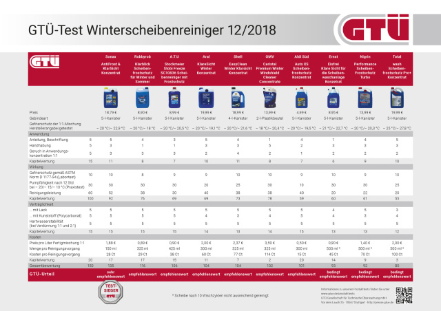 Sieger im großen GTÜ-Vergleich mit dem Prädikat "sehr empfehlenswert" wurde das Sonax AntiFrost &KlarSicht Konzentrat. "Empfehlenswert" waren in der Reihenfolge ihrer Platzierung Robbyrob Klarblick Scheibenfrostschutz für Winter und Sommer, der bei A.T.U vertriebene Stockmeier Stobi Freeze SC10836 Scheibenreiniger mit Frostschutz, Aral KlareSicht Winter Konzentrat, Shell EasyClean Winter Klarsicht Konzentrat, OMV Caristal Premium Winter Windshield Cleaner und Auto XS Scheibenfrostschutz Konzentrat, das bei Aldi Süd im Regal steht. Als "bedingt empfehlenswert" erwiesen sich Ernst Eisfrei Klare Sicht für die Scheibenwaschanlage, Nigrin Performance Scheiben-Frostschutz sowie Total wash Scheibenfrostschutz Pro+ Konzentrat (siehe Ergebnistabelle).