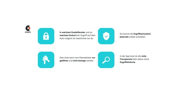 chark funktioniert ganz einfach: Der Nutzer übergibt temporär den digitalen Fahrzeugschlüssel des parkenden Fahrzeugs an einen zuvor von ihm gebuchten Dienstleister. Das Fahrzeug kann dabei nur einmalig geöffnet und geschlossen und nicht bewegt werden. Lässt sich ein Kunde seine Online-Einkäufe direkt in den Kofferraum liefern, so gibt er bei der Bestellung die Adresse des chark Hubs in der Lieferadresse und die persönliche chark ID im Adresszusatz ein. Der Nutzer kann entscheiden, in welchem Zeitfenster und an welchem Parkort der Dienstleister das Fahrzeug öffnen darf. Sobald sich der Zusteller im Umkreis von 500 Meter zum angegebenen Parkort befindet, kann er das Fahrzeug via GPS orten und einmalig öffnen. Damit der Logistikpartner seine Leistungen erbringen kann, muss der Nutzer sicherstellen, dass folgende Punkte erfüllt sind: