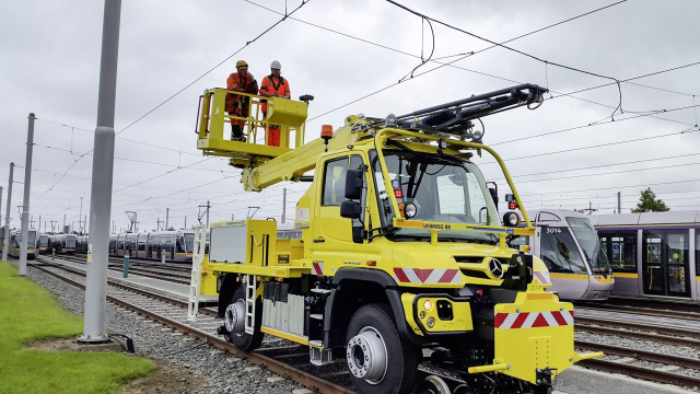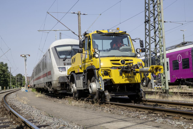Erstmalig wird ein 2-Wege Unimog mit Aufbau zum Schneiden des Lichtraumprofils gezeigt, dessen Ausleger eine digitale Höhenbegrenzung mit Software-Zertifizierung nach EN 50128 enthält. Diese Sicherheits-Funktion ist Voraussetzung für eine Bahnzulassung im deutschen Schienen-Netz. An städtische Verkehrsbetriebe und Staatsbahnen richtet sich die Ausstattung des 2-Wege-Unimog als Hilfsfahrzeug. Sie ermöglicht etwa ein Abschleppen liegengebliebener Straßenbahnen auch bei enger Kurvenführung. Diese Unimog-Variante verfügt über eine Doppelkabine für bis zu 7 Personen und Kofferaufbau sowie hydraulische Aufgleisgeräte