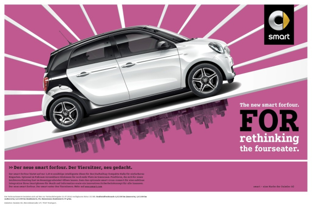 Auch beim smart forfour erfolgt die Print-Kommunikation in zwei Phasen. Die Kernbotschaft der ersten Phase lautet: Der smart unter den Viersitzern. (The smart among the fourseaters.). Dabei steht die Intelligenz des neuen Viersitzers im Vordergrund. Ähnlich dem smart fortwo werden in der zweiten Phase neue und einzigartige Eigenschaften des smart forfour präsentiert: Intelligenz (FOR rethinking the fourseater.), Exterieur (FOR changing the face of the city again.), Sicherheit (FOR being safe, secure, steady and sure.), Konnektivität (FOR apps, maps and chats.), Komfort (FOR more boarding comfort.), JBL Sound System (FOR more bassboom.) und Parken (FOR more parking fun.).Neben den klassischen Print-Formaten finden alle Motive auch in einem umfangreichen Handelsmarketingpaket Anwendung. Die Aktivitäten zu den beiden Produktkampagnen starten für den smart fortwo am 06. Oktober 2014 und für den smart forfour am 10. November 2014.
